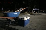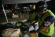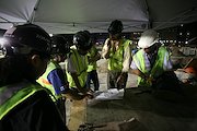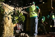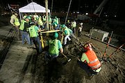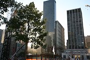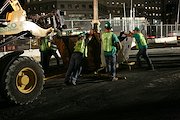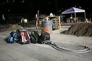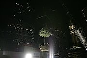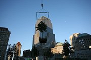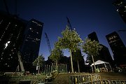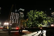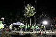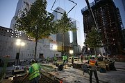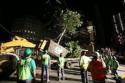 The first trees are brought into and planted on the Memorial Plaza at Ground Zero.